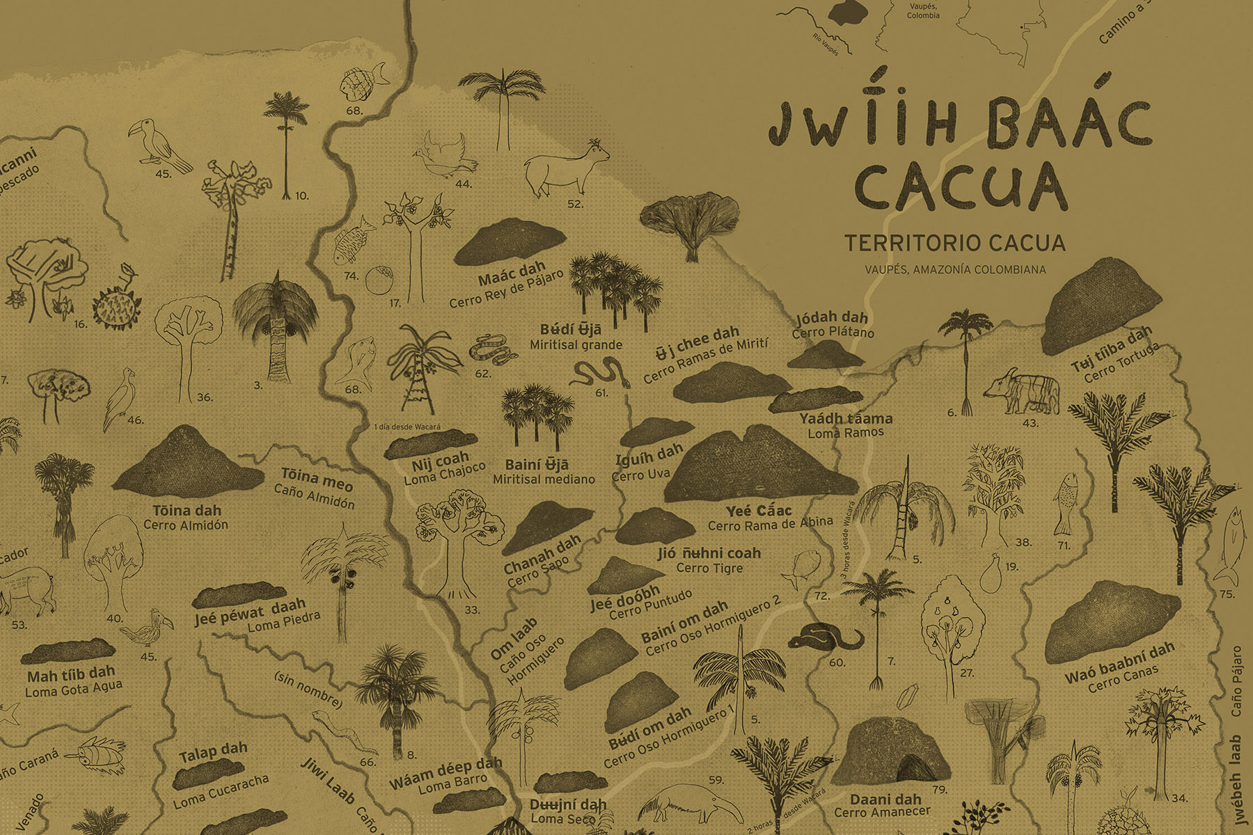 JWIIH BAÁC CACUA (MAPA TERRITORIO CACUA) Vaupés Amazonía colombiana 100 x 150 cm 2025 Cartografía realizada en colaboración con la comunidad de Wacará/ pueblo Cacua en el marco de la investigación participativa sobre la palma táam (Attalea taam) liderada por Juan Carlos Copete, Rodrigo Cámara-Leret y Samuel López Pérez. Un proyecto…